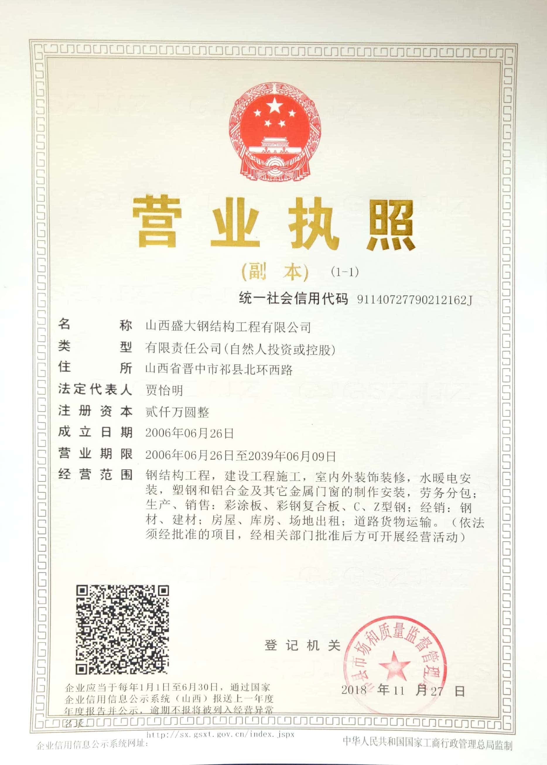 山西盛大鋼結構工程有限公司 山西盛大鋼結構工程有限公司成立于1996年,坐落于國家歷史文化名城——山西祁縣。擁有兩大智能化鋼結構生產基地,占地110畝,建筑面積3萬余平方米,具備鋼結構專業(yè)承包貳級、建筑工程施工總承包貳級資質,是一家集設計、制造、施工于一體的大型鋼結構工程企業(yè)。 盛大鋼構是中國鋼結構協(xié)會會員單位,山西鋼結構協(xié)會副會長單位,山西建筑企業(yè)商會理事單位,山西省土木建筑學會會員單位,擁有國家知識產權局注冊商標。公司已通過ISO9001質量管理體系認證,體系覆蓋鋼結構加工與施工等核心… more +